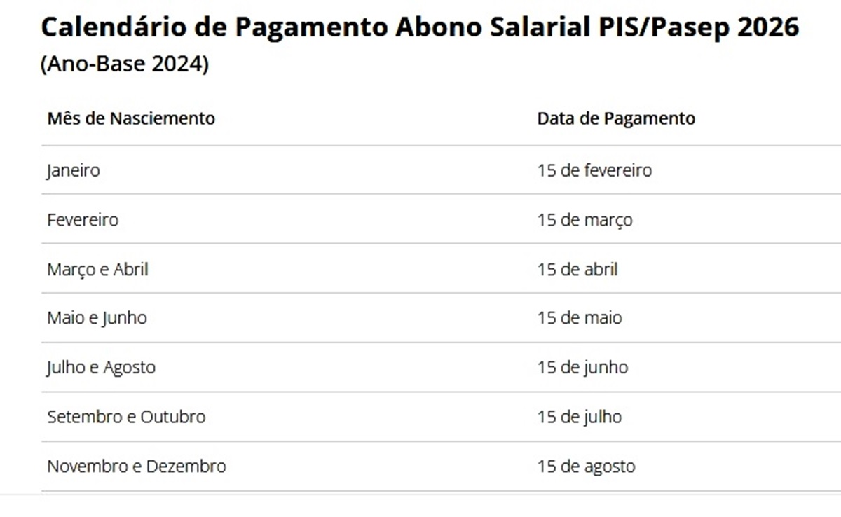 A partir deste ano, o pagamento do PIS/Pasep passa a seguir datas fixas. Os valores serão liberados sempre no dia 15 do mês correspondente ao mês de nascimento — ou no primeiro dia útil seguinte, caso a data caia em fim de semana ou feriado.