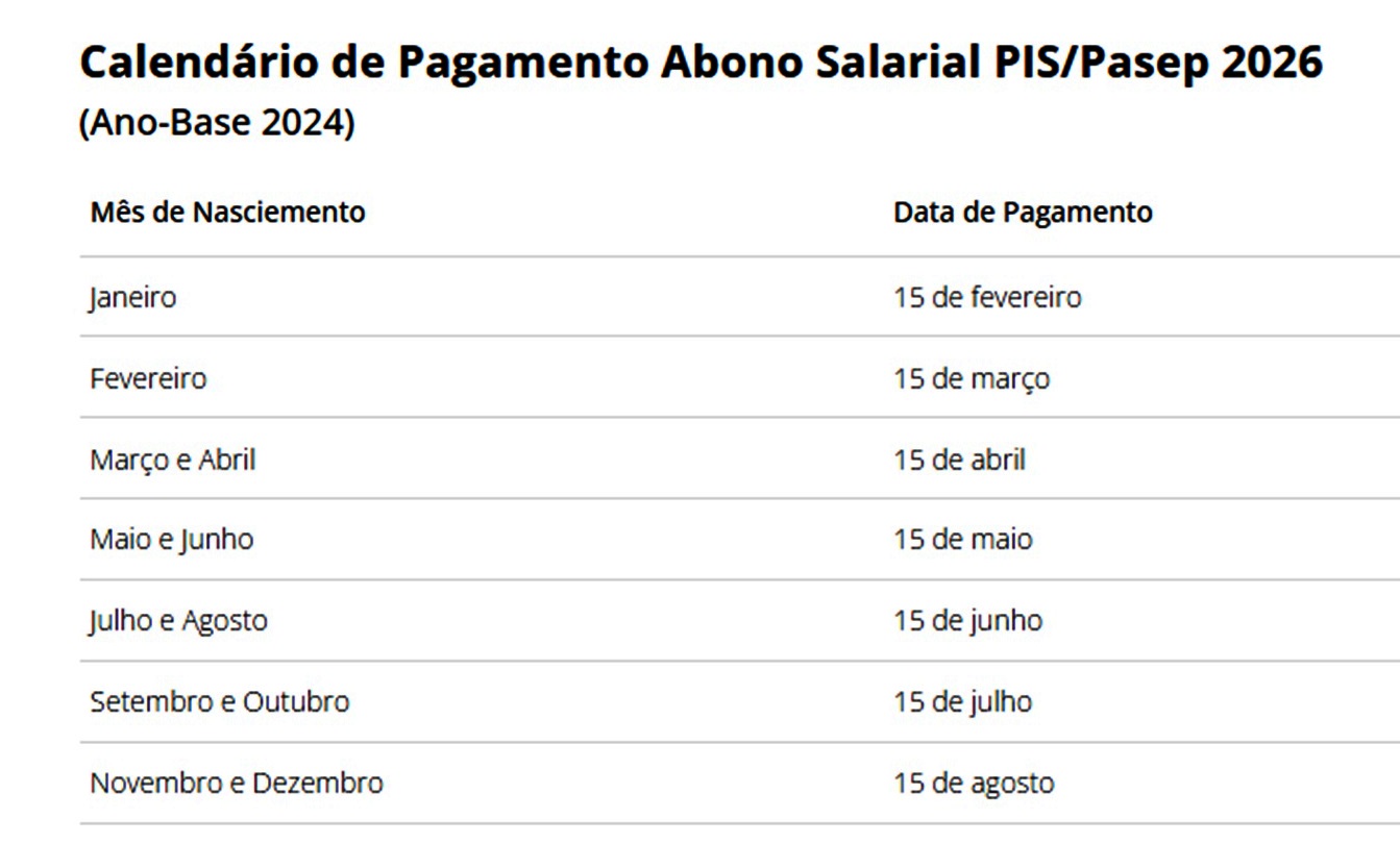 A partir deste ano, o pagamento do PIS/Pasep passa a seguir datas fixas. Os valores serão liberados sempre no dia 15 do mês correspondente ao mês de nascimento — ou no primeiro dia útil seguinte, caso a data caia em fim de semana ou feriado.