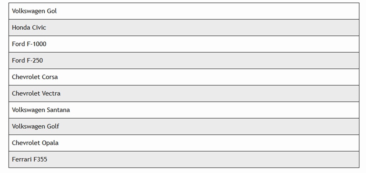 A mudança amplia o universo de modelos beneficiados em todo o país e tem potencial de reduzir o custo desses veículos para os consumidores. Do total de modelos contemplados, o Volkswagen Gol foi o que recebeu maior número de visitas no período no Paraná. Na sequência, estão Honda Civic, Ford F-1000, Ford F-250, Chevrolet Corsa, Chevrolet Vectra, Volkswagen Santana, Volkswagen Golf, Chevrolet Opala e Ferrari F355.