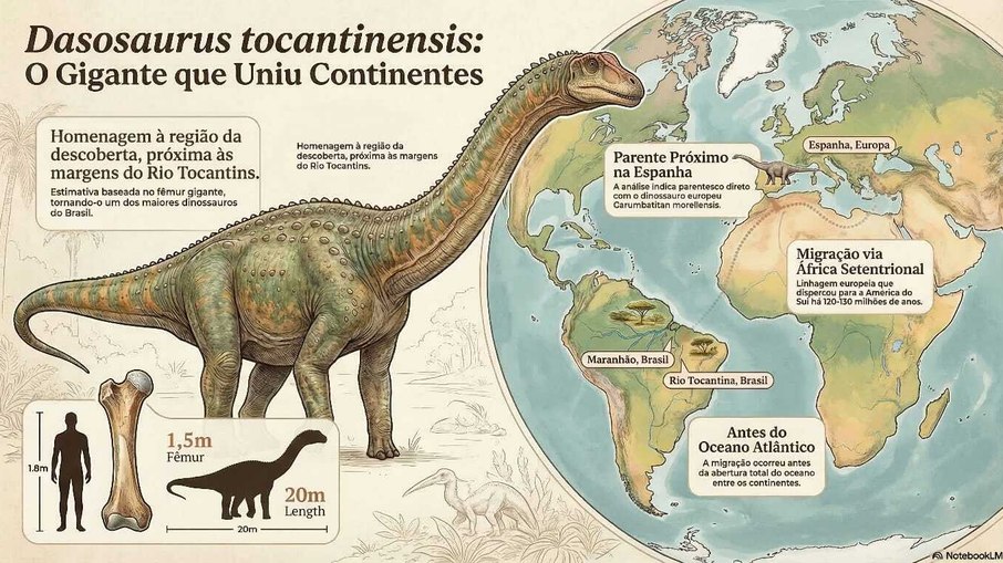 De acordo com os cientistas, a linhagem do animal estaria relacionada a um dinossauro descoberto na Espanha. A conexão reforça evidências de que América do Sul, África e Europa já estiveram ligadas por rotas terrestres há cerca de 120 milhões de anos, antes da formação do Oceano Atlântico.