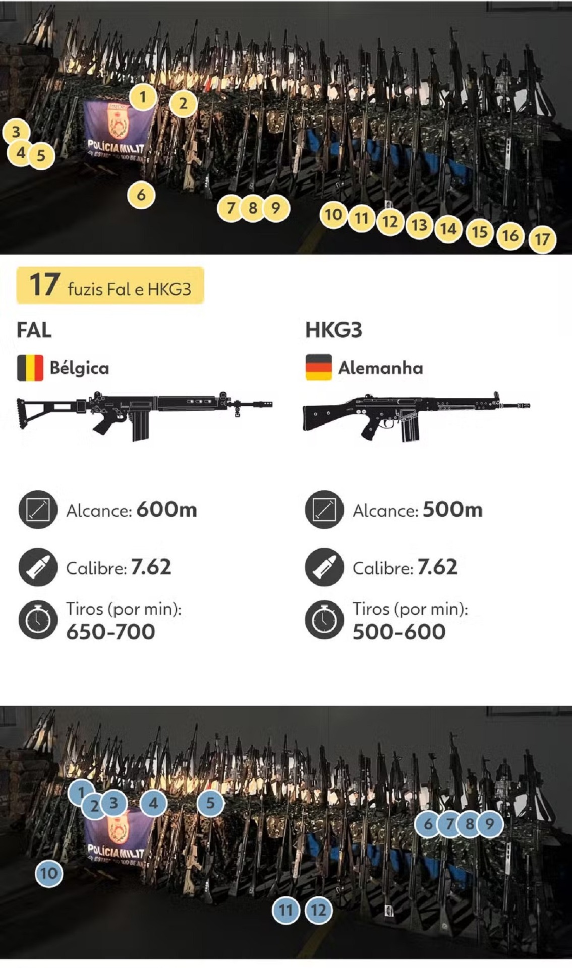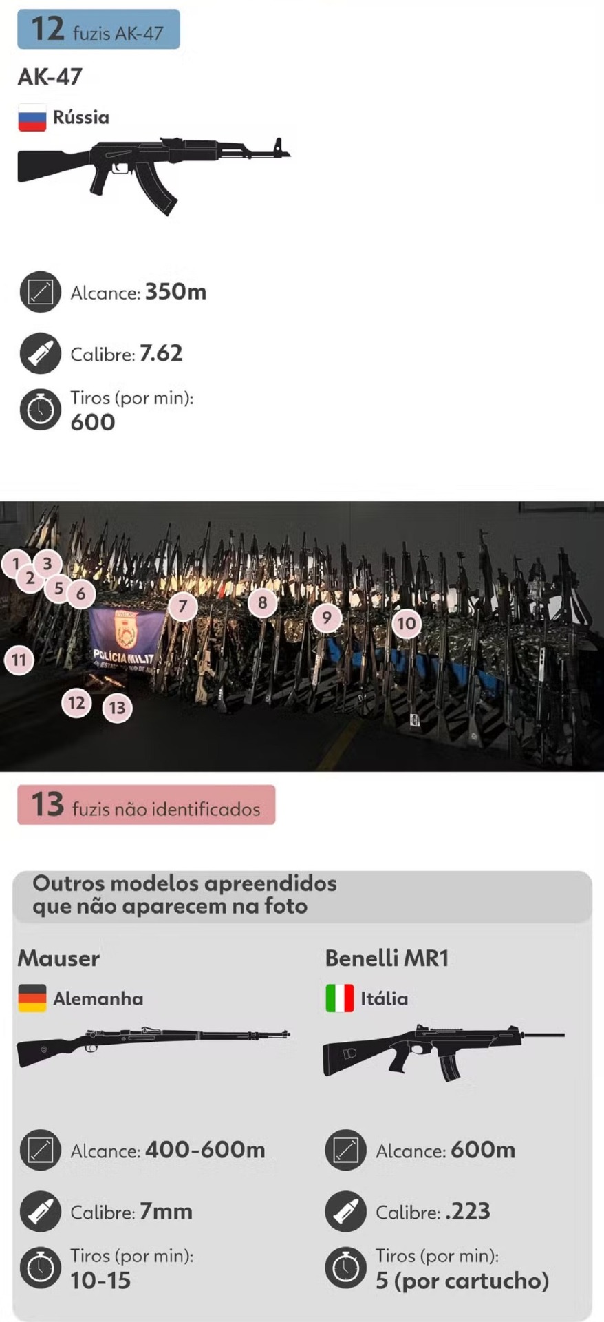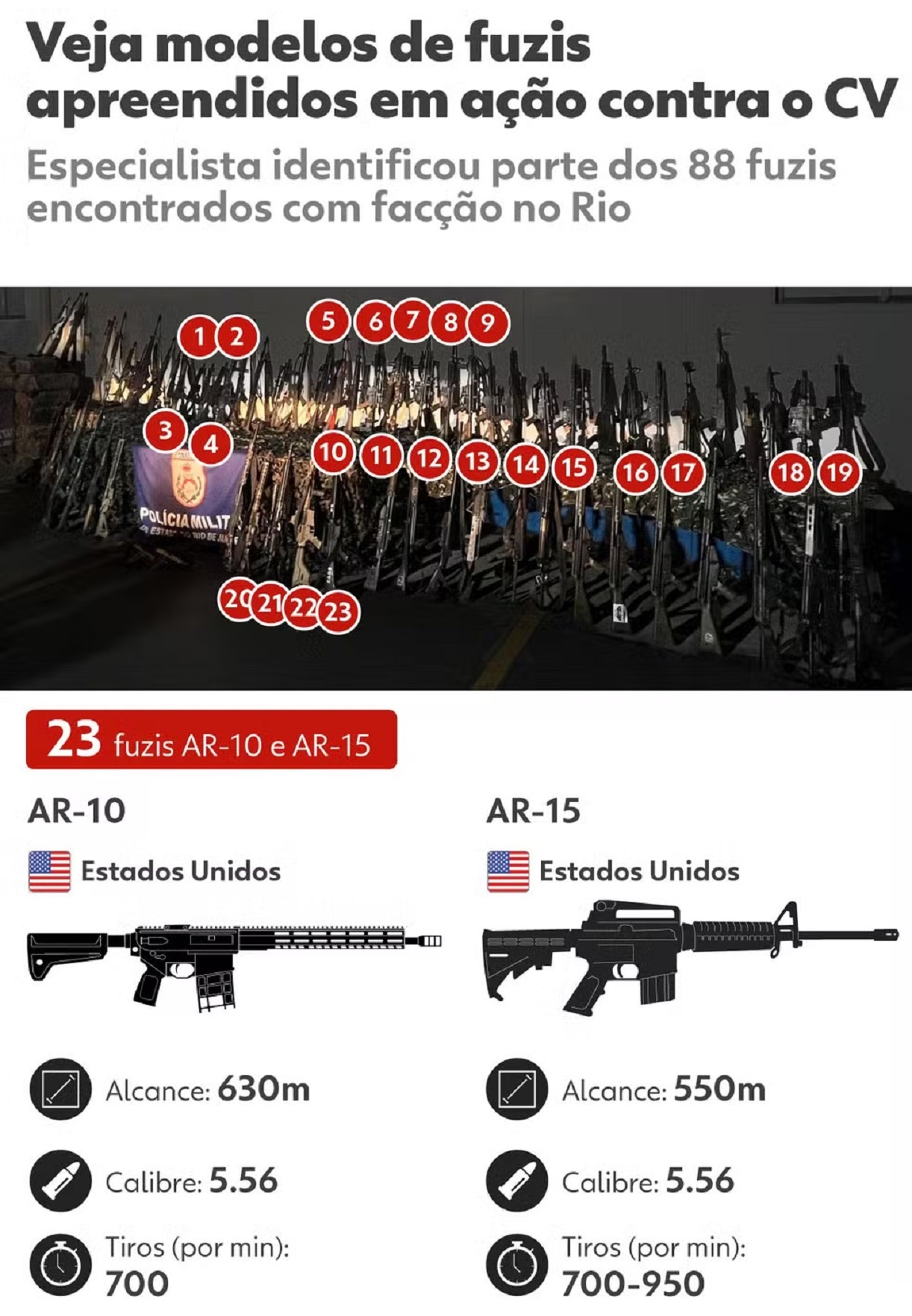 A Polícia do Rio de Janeiro realizou a maior apreensão de fuzis em uma única operação em favelas: foram ao menos 91 armas. Estes armamentos, encontrados na megaoperação contra o Comando Vermelho no Complexo do Alemão, são de calibres capazes de perfurar coletes à prova de bala ou até mesmo paredes. Muitos desses fuzis chegam ao Brasil via fronteira com o Paraguai ou pela Amazônia.