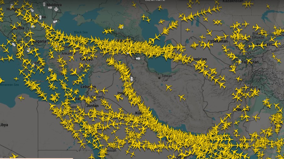 Por volta das 18h30 no horário de Brasília, os sites de monitoramento aéreo mostravam poucos voos no espaço aéreo controlado por Teerã, capital do Irã. As poucas movimentações ainda permanecem: apenas dois voos oriundos de Guangzhou e Shenzhen, na China passaram pelo território em direção à capital do Irã.