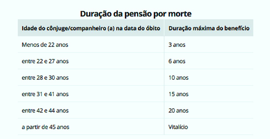 Questões como idade dos filhos, tempo de casamento ou de união estável, além da idade do cônjuge ou companheiro, podem gerar uma variação do tempo de cobertura, que vai de um período determinado até o benefício permanente.