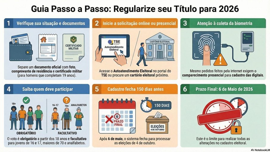 O prazo termina em 6 de maio porque a legislação exige o fechamento do cadastro 150 dias antes da eleição. O primeiro turno está marcado para 4 de outubro.