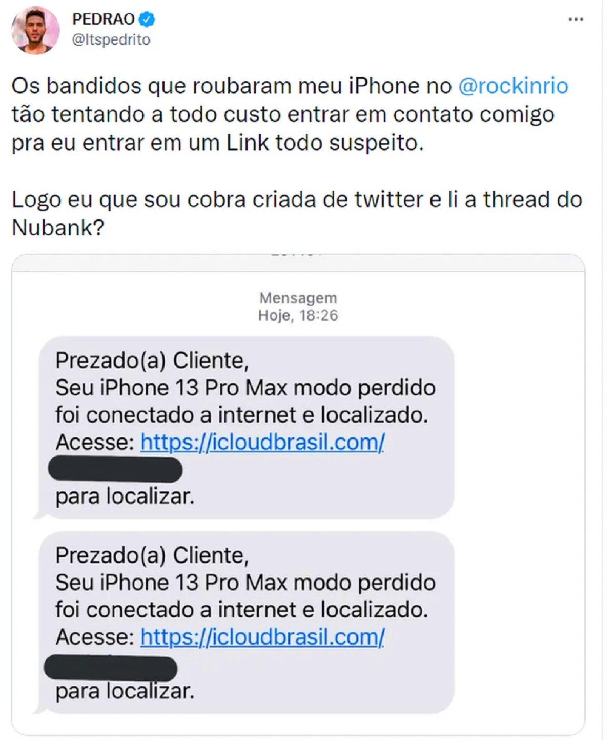 Geralmente, essas abordagens acontecem por SMS, com links maliciosos que pedem dados sensíveis para desbloquear o aparelho, como aconteceu com o influenciador Pedrão (veja a imagem abaixo).